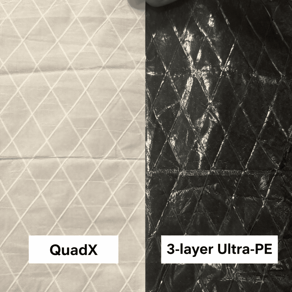 Standardowe Ultra-PE 3-warstwy mają zazwyczaj około 85 g/m², co stawia je w kategorii lekkich laminatów. Quad X ma około 125 g/m², ale ta dodatkowa masa wynika z wprowadzenia czwartej warstwy poliestrowej, która ma realny wpływ na trwałość materiału — a nie tylko na wagę materiału w katalogu. To oznacza praktycznie, że choć QuadX jest trochę cięższy „surowo”, to dzięki większej sztywności i mniejszej potrzebie wzmacniania, końcowa różnica w wadze gotowego skrzydła może być niewielka.