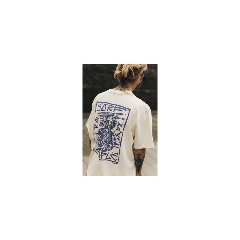 Grafika z motywem ramenu to ukłon w stronę surf-tripów, sesji kończących się głodem i miłości do prostych przyjemności. Koszulka została uszyta z 100% organicznej bawełny premium o podwyższonej gramaturze 230 g. Wodna technika nadruku pozwala grafice wtopić się w strukturę materiału, dzięki czemu pozostaje ona trwała i estetyczna nawet po wielu praniach.